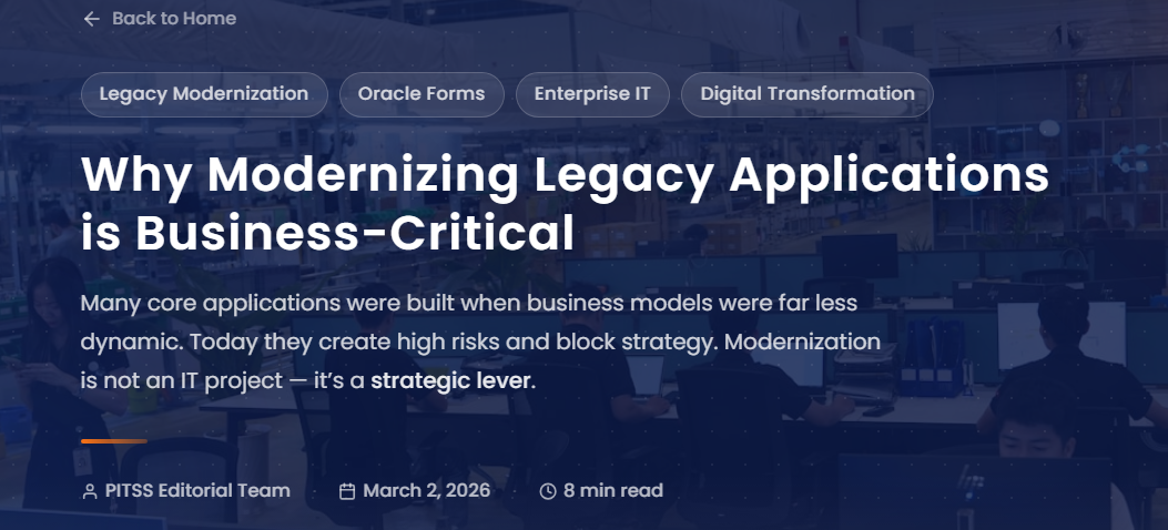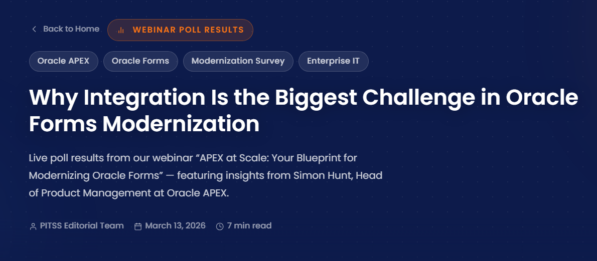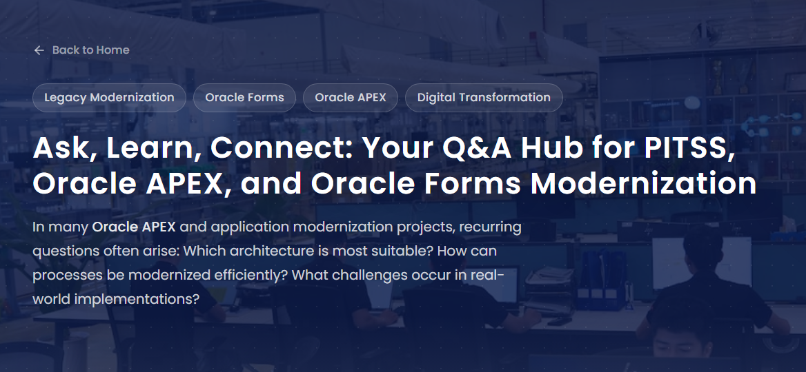 Back to Home Legacy Modernization Oracle Forms Oracle APEX Digital Transformation Ask, Learn, Connect: Your Q&A Hub for PITSS, Oracle APEX, and Oracle Forms Modernization In many Oracle APEX and application modernization projects, recurring questions often arise: Which architecture is most suitable? How can processes be modernized efficiently? What challenges occur in real-world implementations? In […]